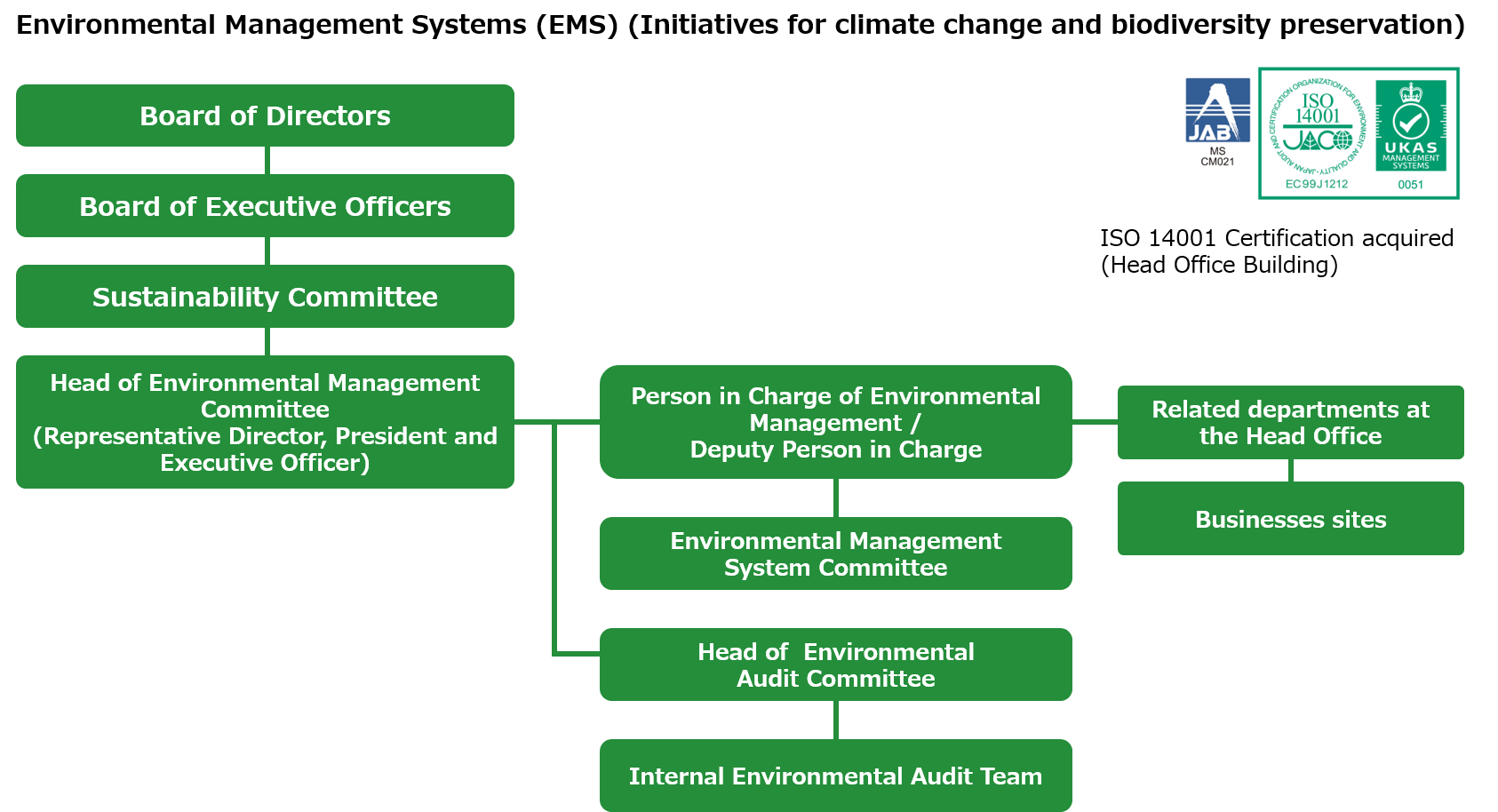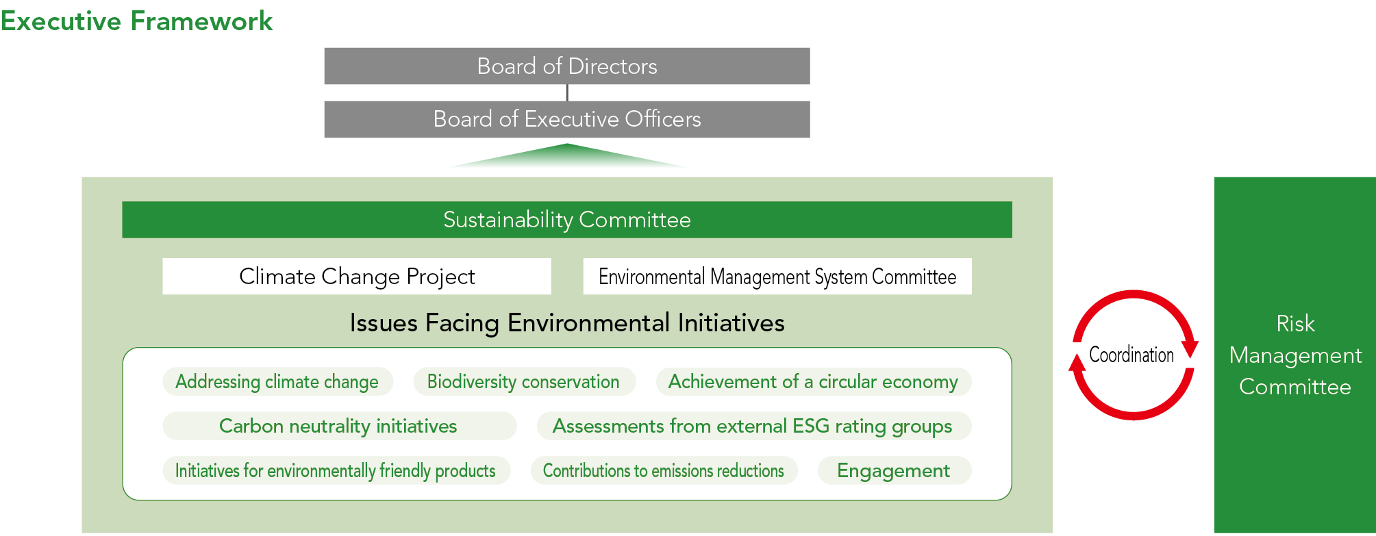 Risks and opportunities related to environmental issues such as climate change and biodiversity conservation, as well as the measures to address them, are proposed through the Climate Change Project. These measures are discussed by the Sustainability Committee and the Risk Management Committee, both of which are comprised of the Representative Director, President and Executive Officer, other executive officers, Audit and Supervisory Committee members, and department heads (including officers at subsidiaries). Following these discussions, final decisions are made by the Board of Executive Officers, the Company’s central body for business execution, under the supervision of the Board of Directors. Progress on approved measures is reported at the Sustainability Committee. Meanwhile, progress on key risk-related matters is reported to the Risk Management Committee, ensuring consistent monitoring of company initiatives.