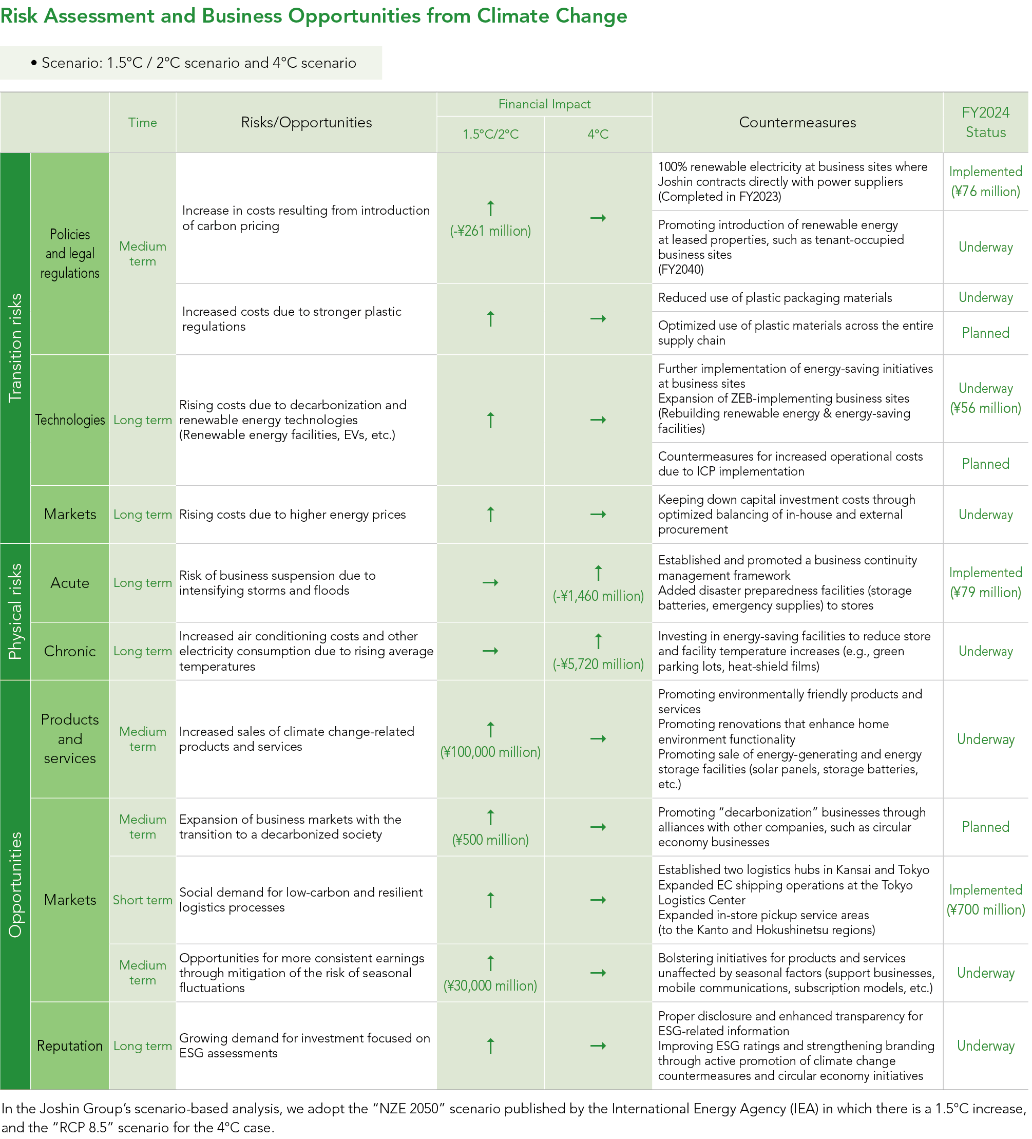 The Joshin Group conducts scenario-based analyses assuming global average temperature increases of 1.5/2°C and 4°C respectively, with the aim of assessing the risks and opportunities that climate change poses to the Group and impact on our businesses, as well as formulating appropriate countermeasures.