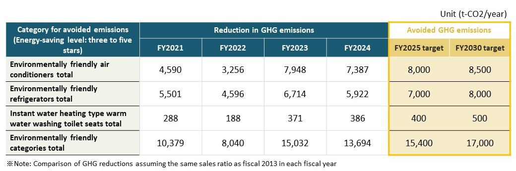 For the above, we set a replacement cycle guideline using refrigerators, air conditioners, and instant-heating warm-water washing toilet seats made in FY2013 as the base models. Based on this, the reduction contribution was calculated by comparing the difference in GHG emissions that would result if the same number of environmentally friendly products sold during FY2021–FY2024 had been sold instead of the baseline models.
