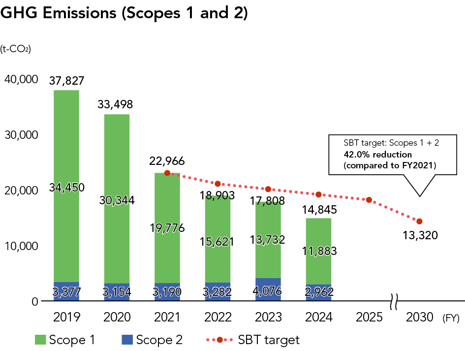 Among the seven material issues (materiality) of the Joshin Group, we have positioned “Contribute to a prosperous society in harmony with the global environment,” as one of the highest priority issues. In particular, to reduce GHG emissions, we have set the GHG emission reduction goals as the medium-term targets for GHG emissions by fiscal 2030: cut 42.0% in Scopes 1 and 2 compared with fiscal 2021, cut 25.0% in Scope 3 (Categories 1, 11) compared with fiscal 2021. We also applied for SBT certification in fiscal 2023. These goals are in line with 1.5°C surface temperature target that was agreed in the Paris Agreement, the international framework for combatting climate change. The goal is to hold the rise in global average surface temperature to less than 1.5°C over preindustrial levels.