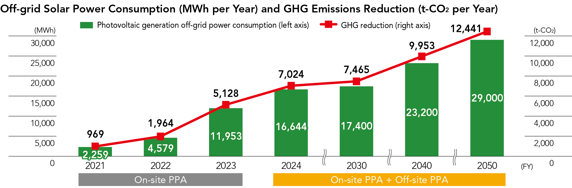 We began working for carbon neutrality at Group business sites from an early stage, and have actively introduced solar power generating systems through on-site and off-site PPA.