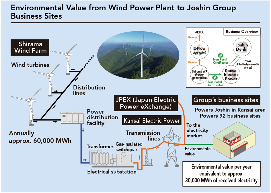 The Joshin Group has entered into a virtual power purchase agreement (Virtual PPA) with Kansai Electric Power Co., Inc. and Shirama Wind Farm Co., Ltd. (part of the Kinden Group, hereinafter “Shirama WF”), with operations scheduled to begin in October 2025.