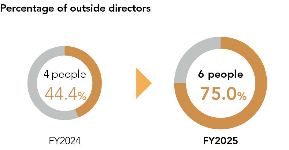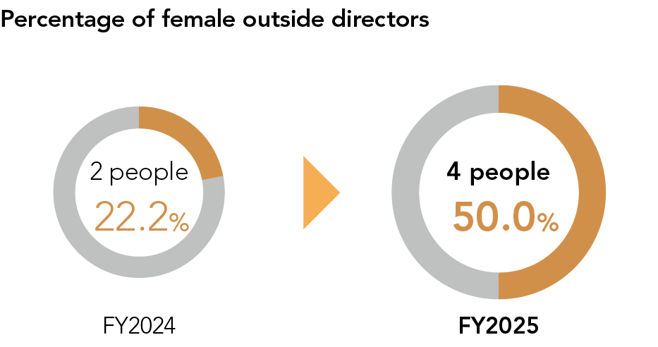 Of the eight directors, six are independent outside directors (75.0%) and four are female directors (50.0%). There are three directors who are Audit and Supervisory Committee members, three of them being independent outside directors (100.0%), and two being women (66.7%). (See p. 54 for more on skill diversity.)