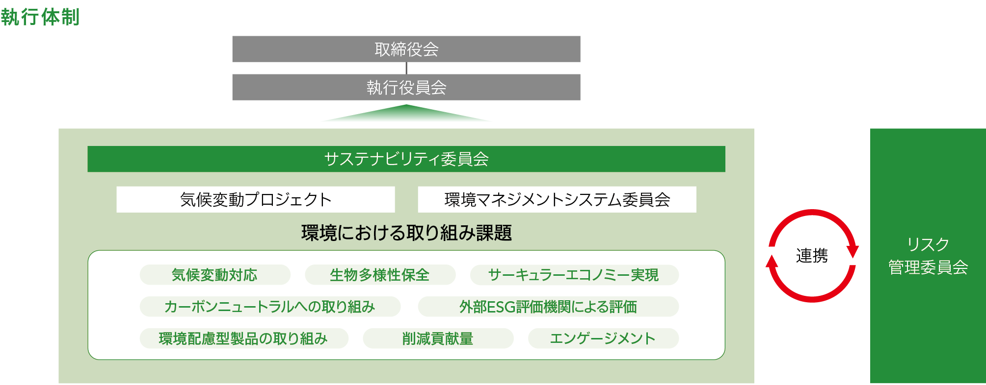 その取締役会のなかでも、当社のグループの代表取締役兼社長執行役員は、会社を代表して業務執行を指揮監督する者として、環境課題に対しても説明責任を担っています。