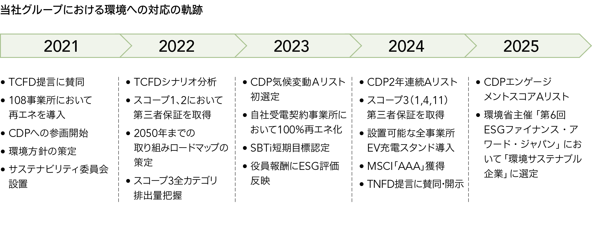 当社グループに影響をもたらす中長期的な課題を分析し、リスク要因を洗い出すとともに、それら中長期の事業戦略立案につなげています。環境に係る取り組みの進捗及び課題については、気候変動プロジェクトにおいて検討後、サステナビリティ委員会に報告されます。執行役員会はサステナビリティ委員会からの報告を受け、当社グループの環境を含むサステナビリティ全般に関する対応などについての審議を実施し、それらを取締役会が監督しています。さらに、主要なリスクに関する内容については、リスク管理委員会がグループ内で検討・管理しています。