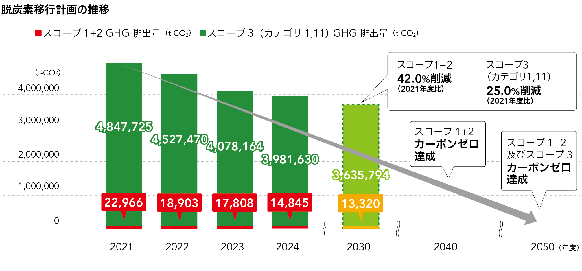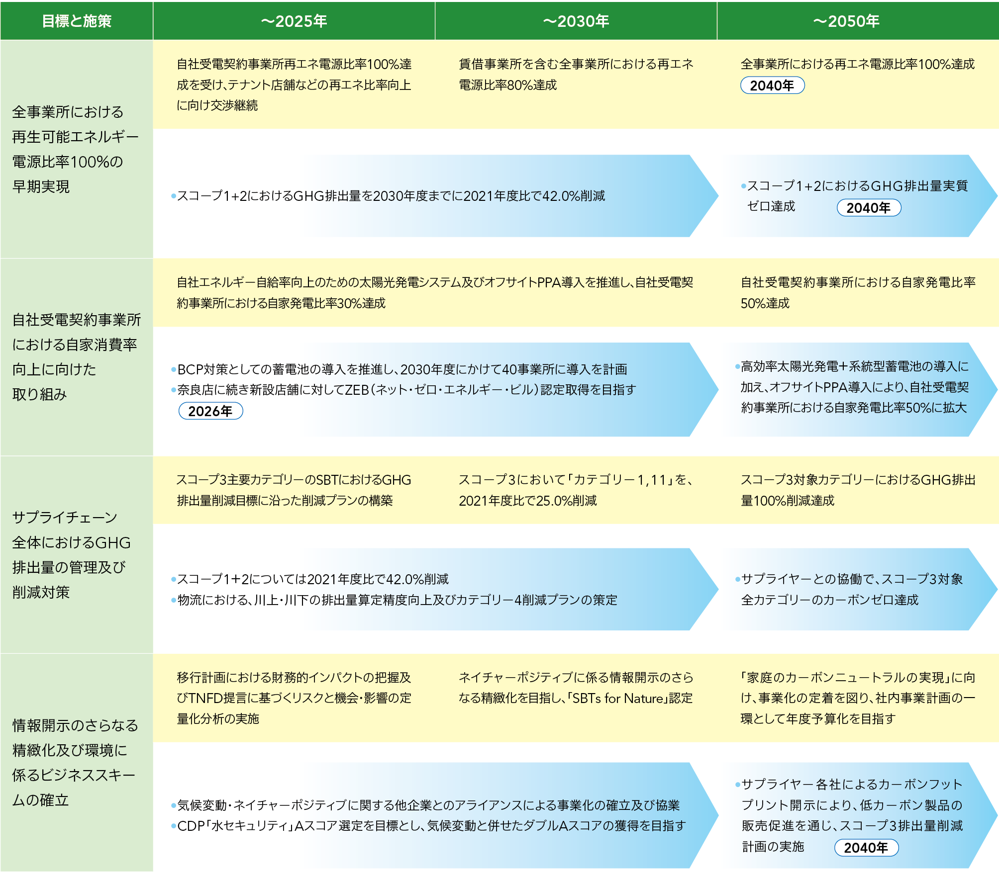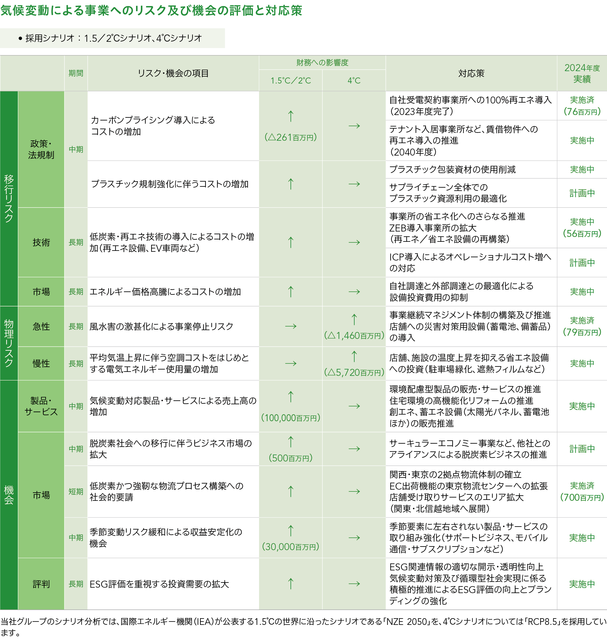 当社グループは、気候変動がグループに与えるリスク・機会及び事業に与えるインパクトの評価とその対応策の構築を目的として平均気温が1.5/2℃及び4℃上昇時のシナリオ分析を実施しています。それぞれの平均気温上昇時に移行リスク/物理リスクと機会において事業インパクトを特定し、2030年までの対応策実現に向けて動き出しています。長期目標である2050年までの主な目標については7つのマテリアリティに記載しています。これらを前提に、気候変動の影響を分析し、いずれの平均気温上昇時においても事業戦略や中期経営計画に基づき新たな成長機会を策定します。