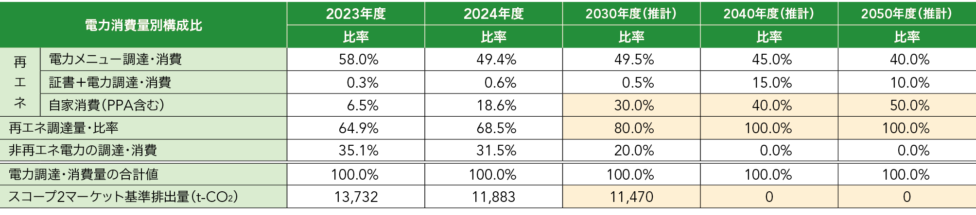 これらの取り組みに加え、太陽光発電システム設置不可の事業所においては再生可能エネルギー契約を完了し、2023年度には自社受電契約事業所149事業所すべてに再エネへの切り替えが完了しました。
