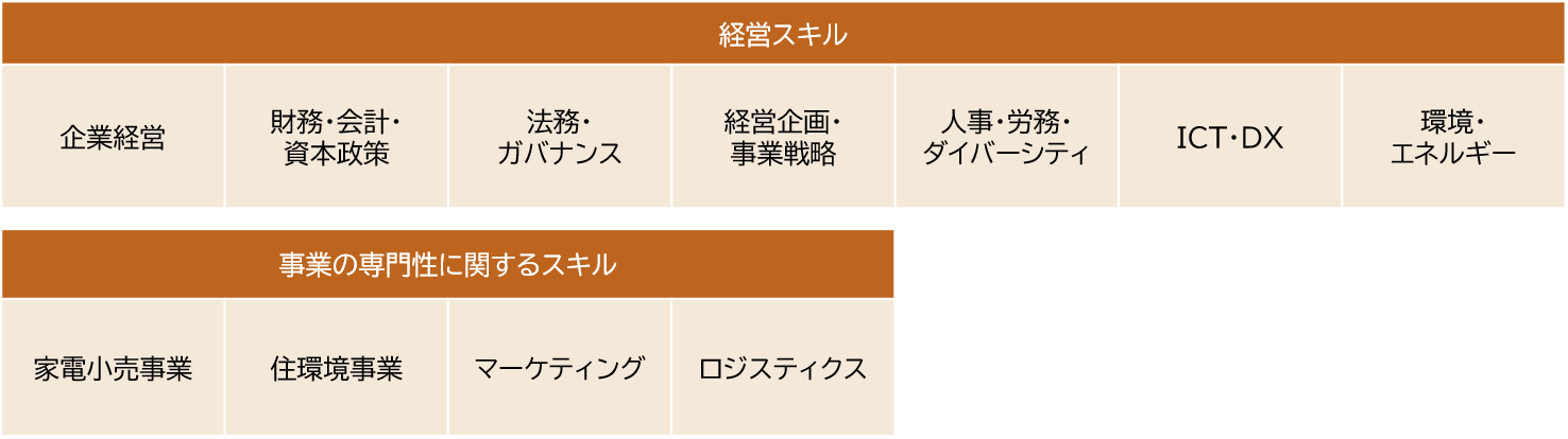 祖業であり、最大の収益基盤である「家電小売事業」を中長期的な中核事業に位置づけ、その事業インフラを活用できるなどの親和性の高い関連事業を開発して新たな収益事業に育成していくため、家電小売事業の知見・経験が必要である。 |