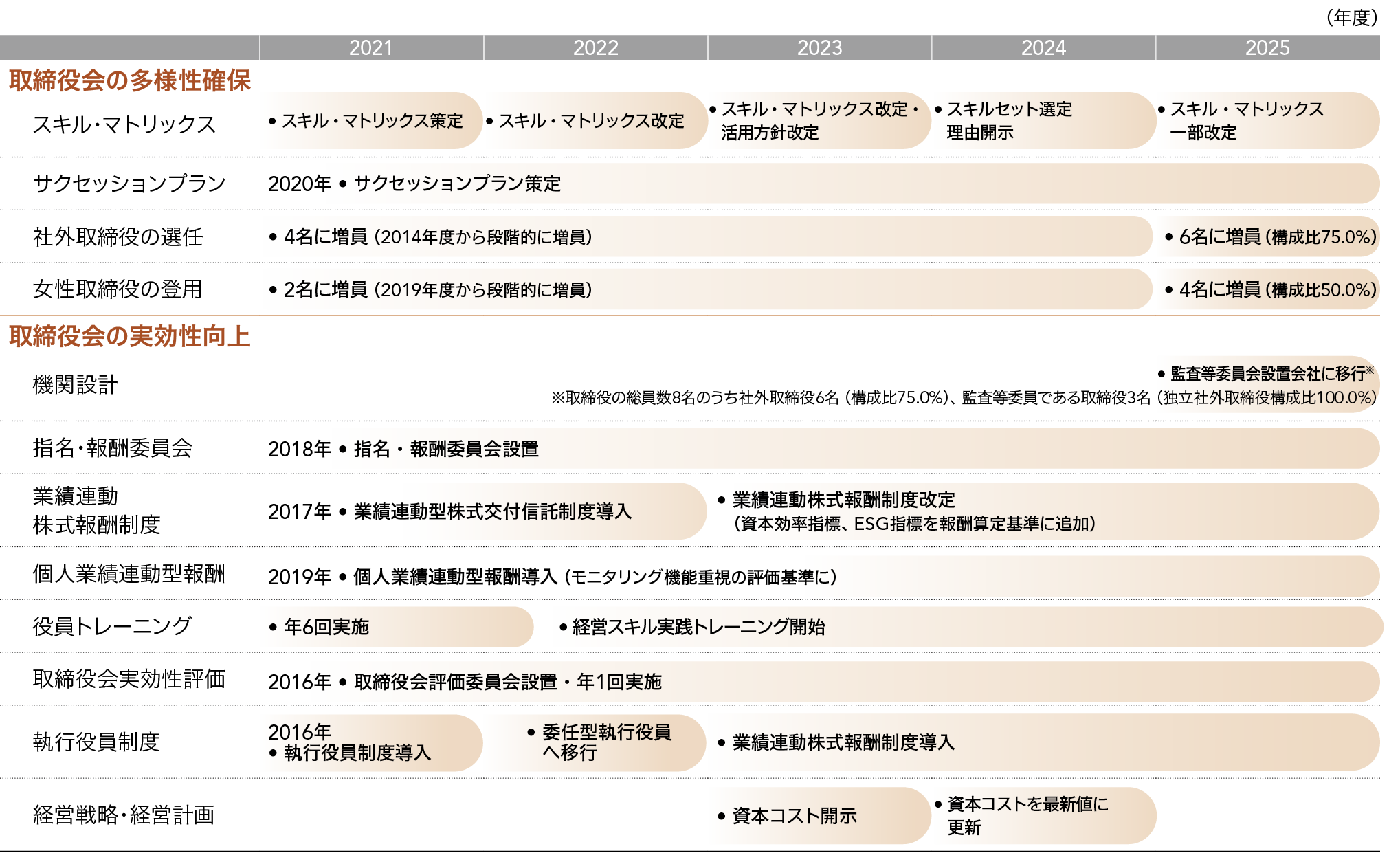 当社はこれまで、独立社外取締役の増員、女性取締役の登用による多様性の確保、執行役員制度の導入、社外取締役を過半数とする指名・報酬委員会及び取締役会評価委員会の設置、業績連動型株式報酬制度の導入など、取締役会の実効性向上を目的としたコーポレート・ガバナンス体制の充実に取り組んできました。