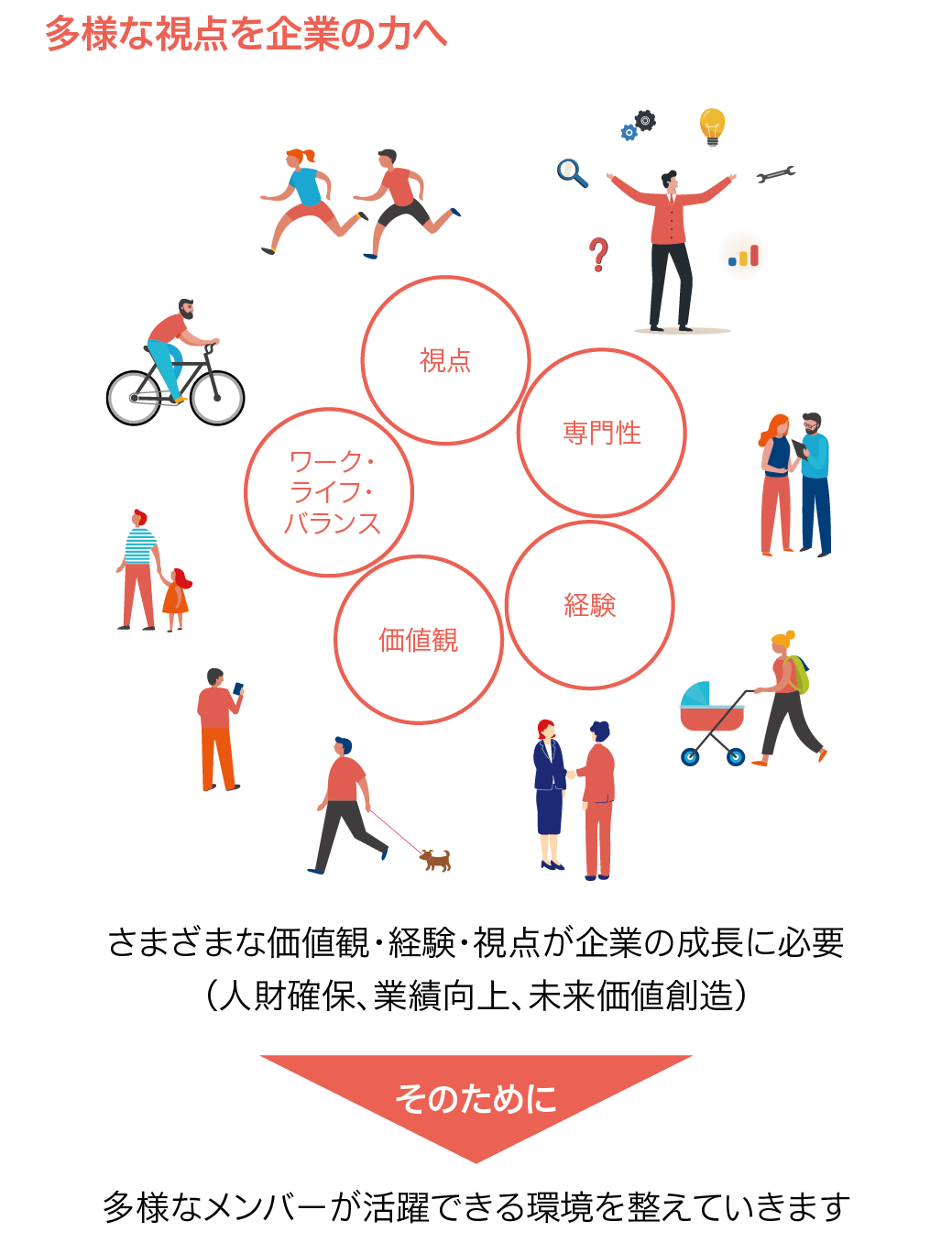 経験や知識・視点や価値観の異なる従業員が集い、それぞれの“個”や“違い”が受容されるダイバーシティ&インクルージョンの社内環境を構築することで、“知”と“アイデア”をふくらませ、社会の変化がもたらすリスクを抑制しつつ、新たな社会価値の創出につなげることができる、力強い経営組織を創り上げていきます。