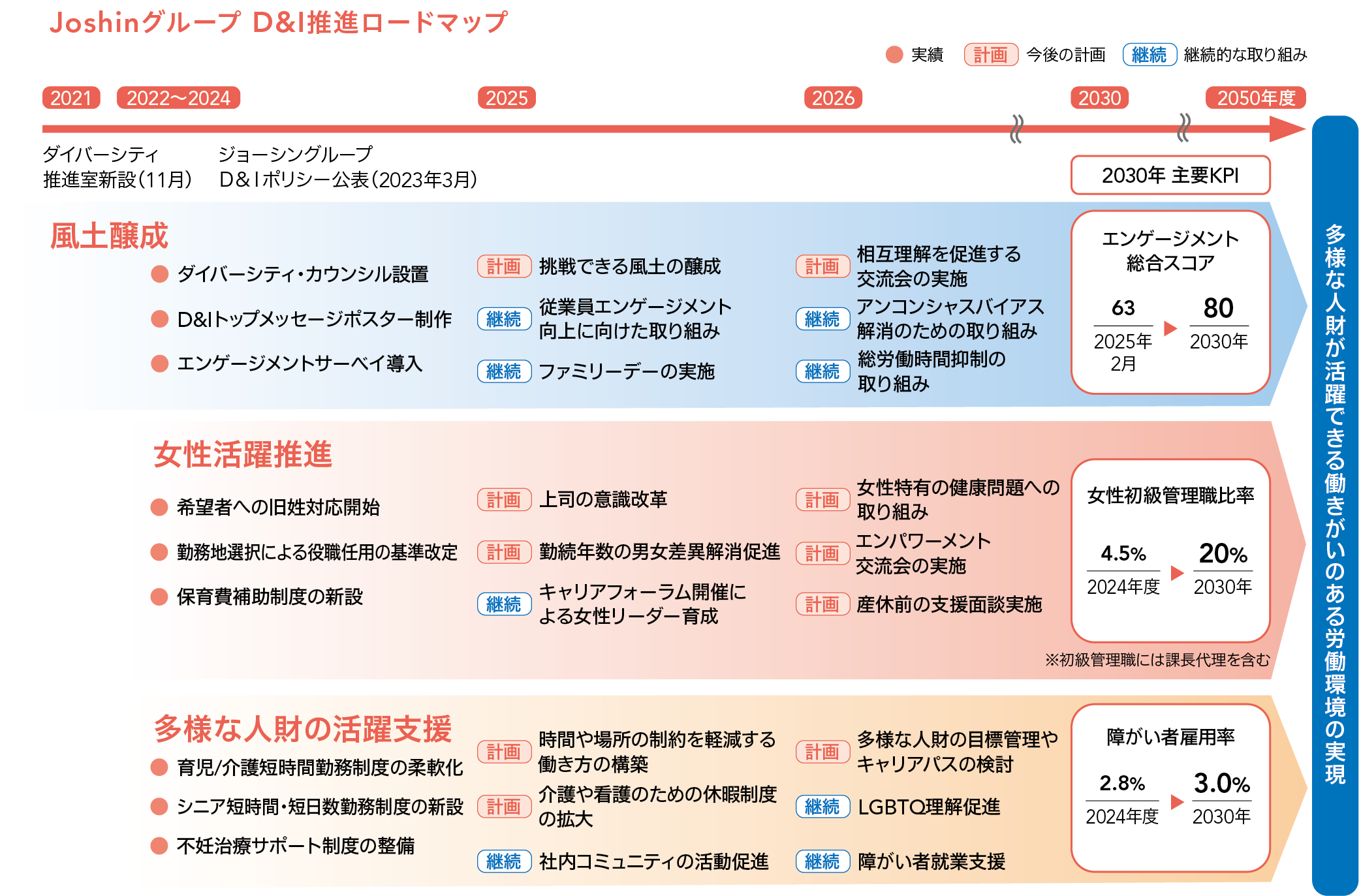 D&I推進により目指す姿を、「すべての従業員の活躍と企業としての持続的な成長」と捉え、その考え方を「ジョーシングループD&Iポリシー」として 2023年3月に公表しました。