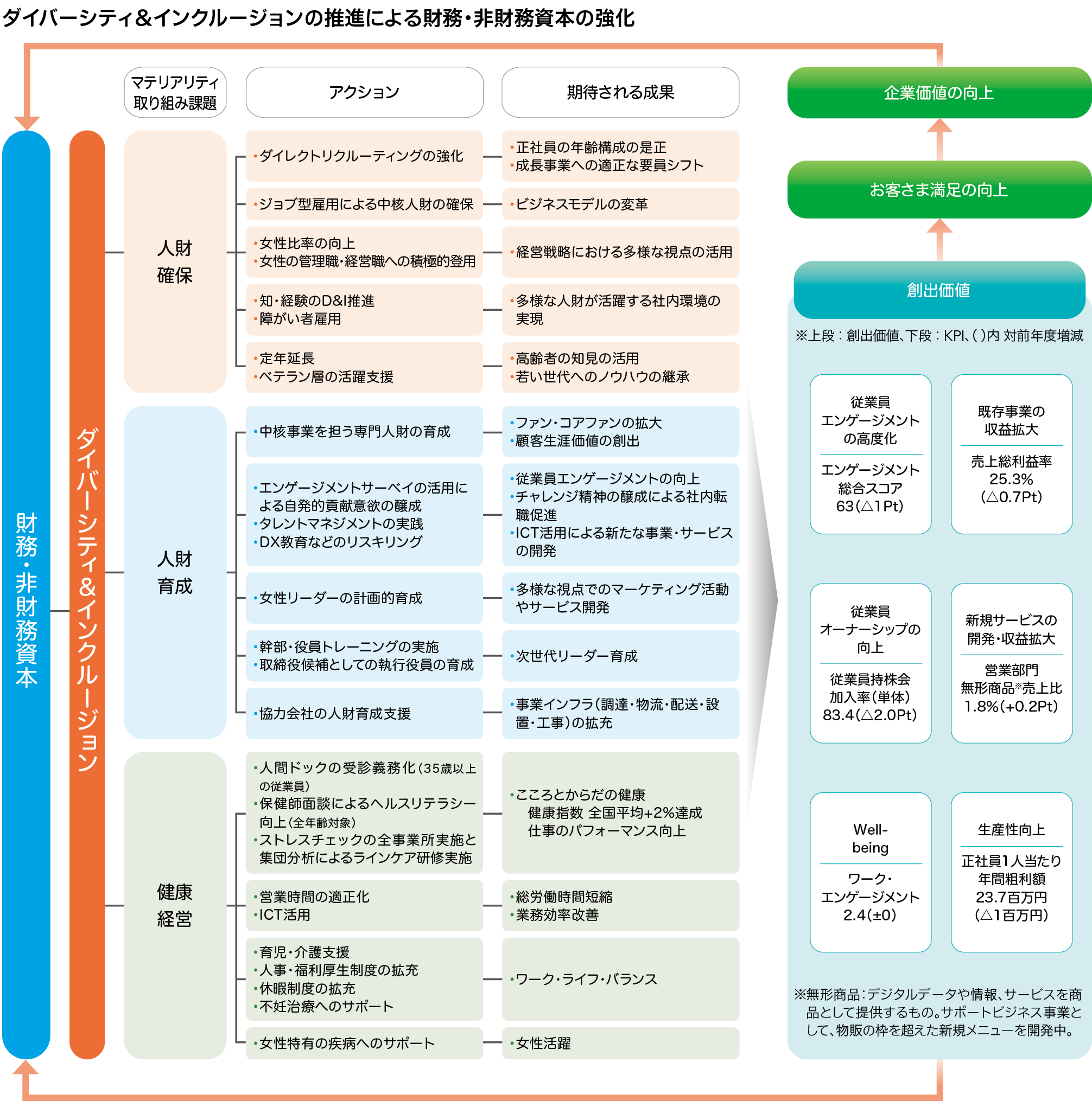 当社グループは、ダイバーシティ&インクルージョンを柱とする人財戦略により、個の力を組織のパフォーマンス向上につなげ企業価値を向上させます。その結果得られた財務・非財務資本を再投資し、新たな価値を創出する好循環を創り出していきます。