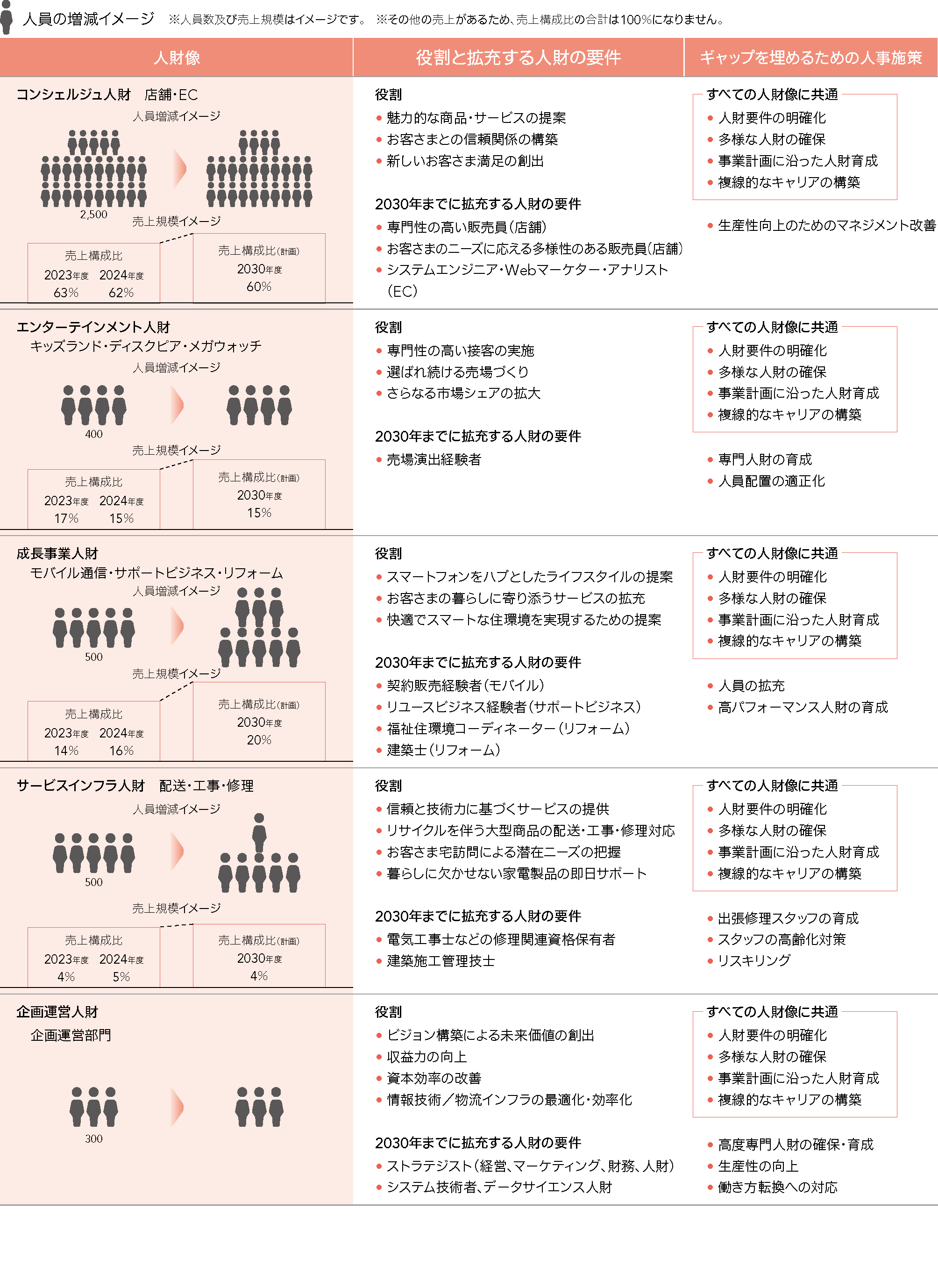 2030年のあるべき姿とのギャップを埋めるための動的な人員計画です。経営戦略と連動させて計画し、社会の変化や計画の進捗状況に合わせて修正を加えながら、求める人財を確保・育成していきます。