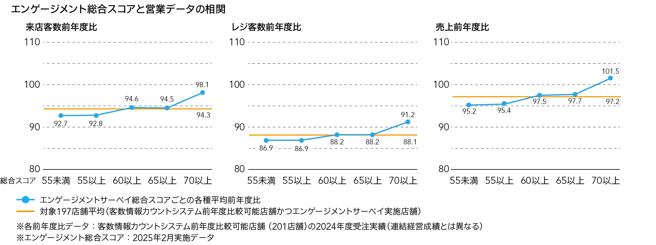また、エンゲージメント総合スコアは来店客数・レジ客数・売上データに相関が見られます。エンゲージメントは組織のパフォーマンスとつながっています。