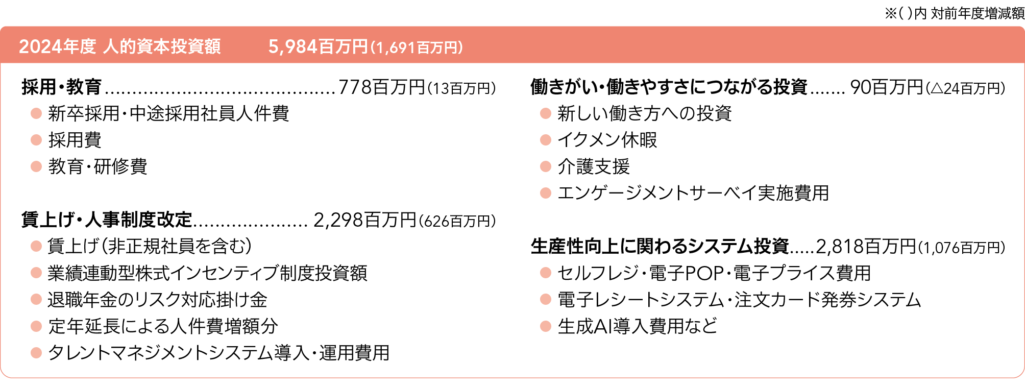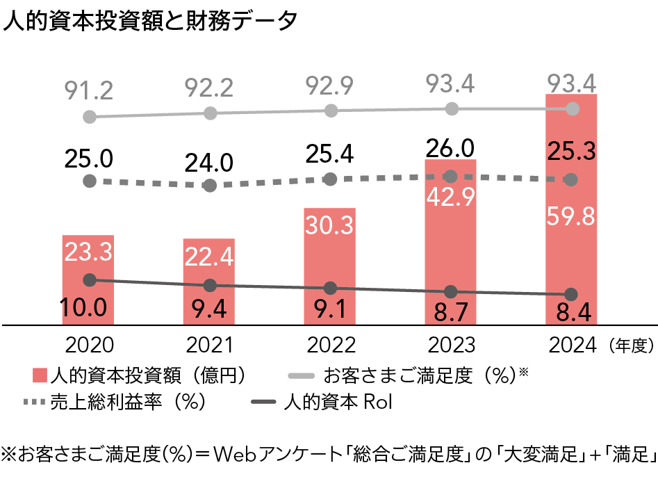 未来価値を生み出す人への投資を従来より重視してきました。採用・教育や賃上げのみならず、働きがいと働きやすさにつながる投資や、システム導入により労力を省き生産性向上につながる投資についても人的資本投資と定義しています。
