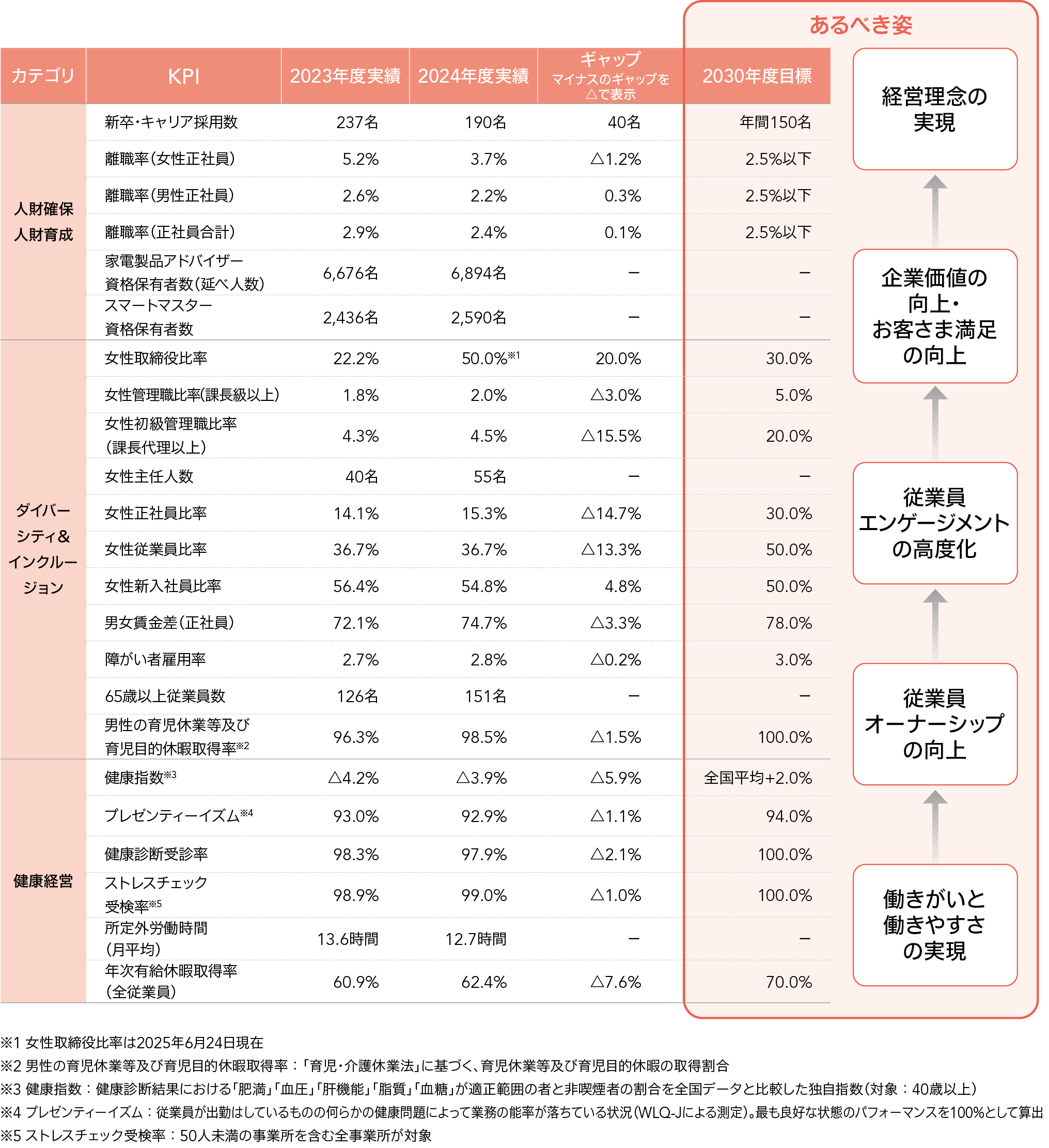 あるべき姿とのギャップを埋めるために改善が求められる項目についてKPIを設定し、多様な人財が活躍できる働きがいのある労働環境の実現に取り組んでいます。