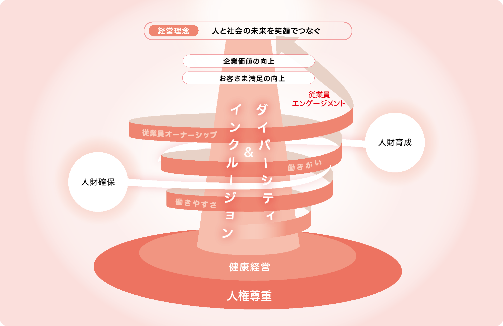 当社グループの人財戦略は、普遍的な価値観である「人権尊重」と人財のポテンシャルを最大限に引き出す「健康経営」を基盤に据え、D&Iを戦略の柱として、多様な人財の確保・育成に取り組んでいます。お客さまの多様なニーズに応えられる【人財の確保】、新たな成長事業を支える【人財の育成】、【従業員エンゲージメントの高度化】の取り組みを“新たなお客さま満足=新たなビジネス”の創出につなげ、企業価値の向上に結びつけていく人財戦略は、サステナブルな社会への貢献を目指す経営戦略と一体であると考えています。