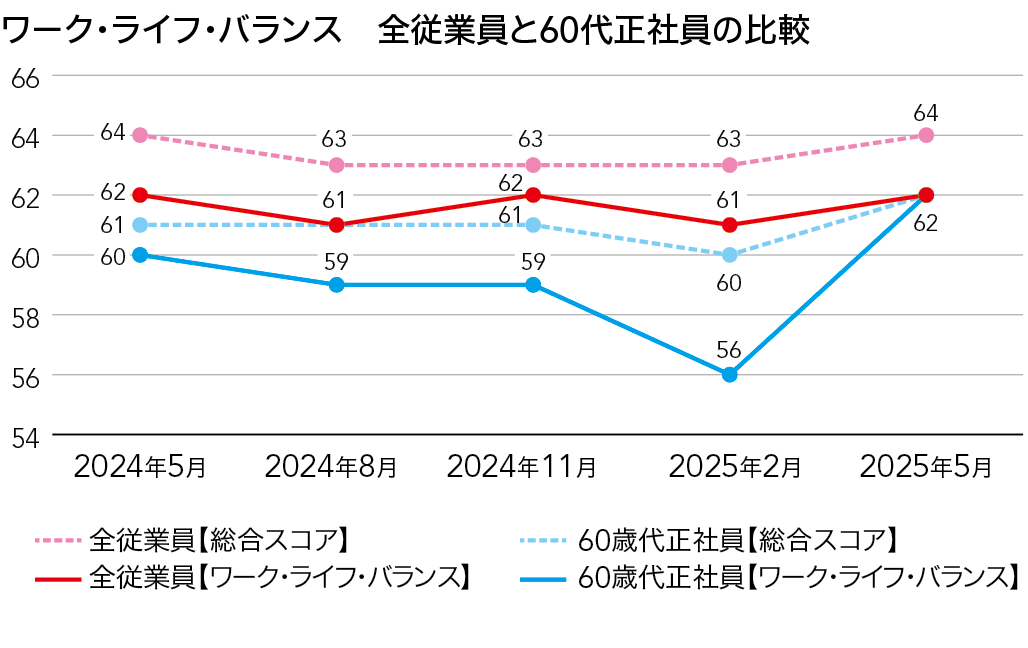 60代正社員のエンゲージメント改善が課題でした。2025年4月に柔軟な働き方としてシニア短時間・短日数勤務制度を導入し、ワーク・ライフ・バランスのスコアが改善しています。また、60歳以降の役割を明確化するキャリア面談の運用を始め、「やりがい」が1ポイント、「ミッション・ビジョンへの共感」が2ポイント改善しました。