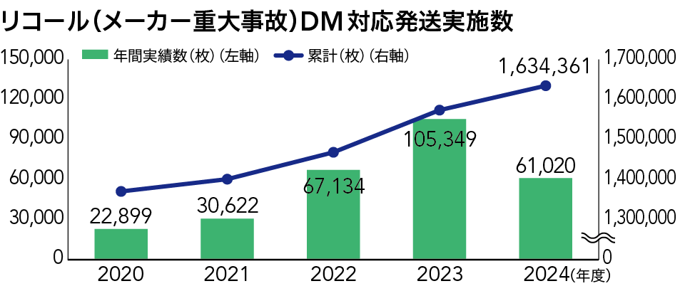 サプライヤーからリコールの報告を受けた際には、可能な限り対面での面談を要請し、危険性の度合いや緊急性、対応方法についての説明を受け、不具合の内容によっては、当社で直接対応を請け負うかの協議も行っています。それらの内容を踏まえて、お客さまへ発送するDMについての打ち合わせを重ねています(年間20回程度実施)。製品本体のリコールの際に、付属品・消耗品をご購入のお客さまにもDMをお送りしており、不具合情報を目にする機会を増やすことで、少しでもリコールによる被害を減らしたいと考えています。