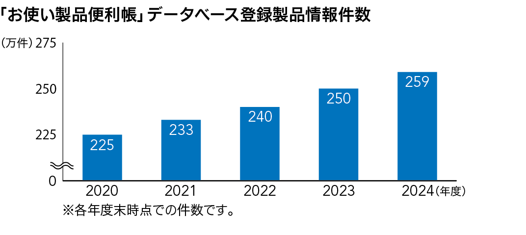 不具合情報は、「お使い製品便利帳」データベースにて管理しています。このデータベースには、約259万件(2025年3月末時点)の製品情報・関連情報を搭載し、消耗品・付属品などの関連情報や不具合情報まで、従業員が携帯するPDA端末や店舗PCなどから簡単に引き出せる、当社独自のシステムです。