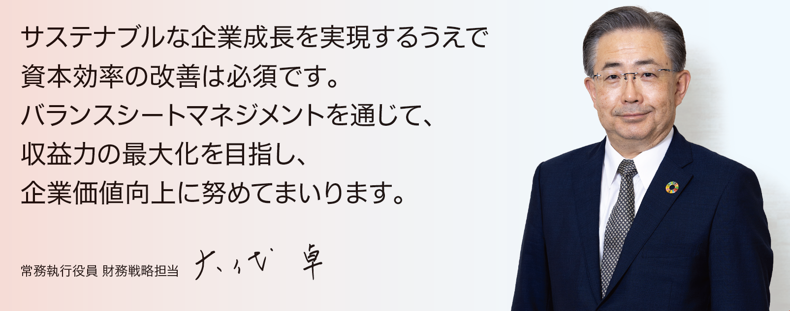当社は、サステナブルな企業経営を目指して、最適な事業ポートフォリオの構築、そのための成長投資を積極的に進めていますが、その前提には全社経営指標であるROA、ROICの確保を想定しての投資判断が必要と考えています。今後も、営業戦略担当役員とも連携のうえ、効率経営を前提とした積極投資を進めてまいります。