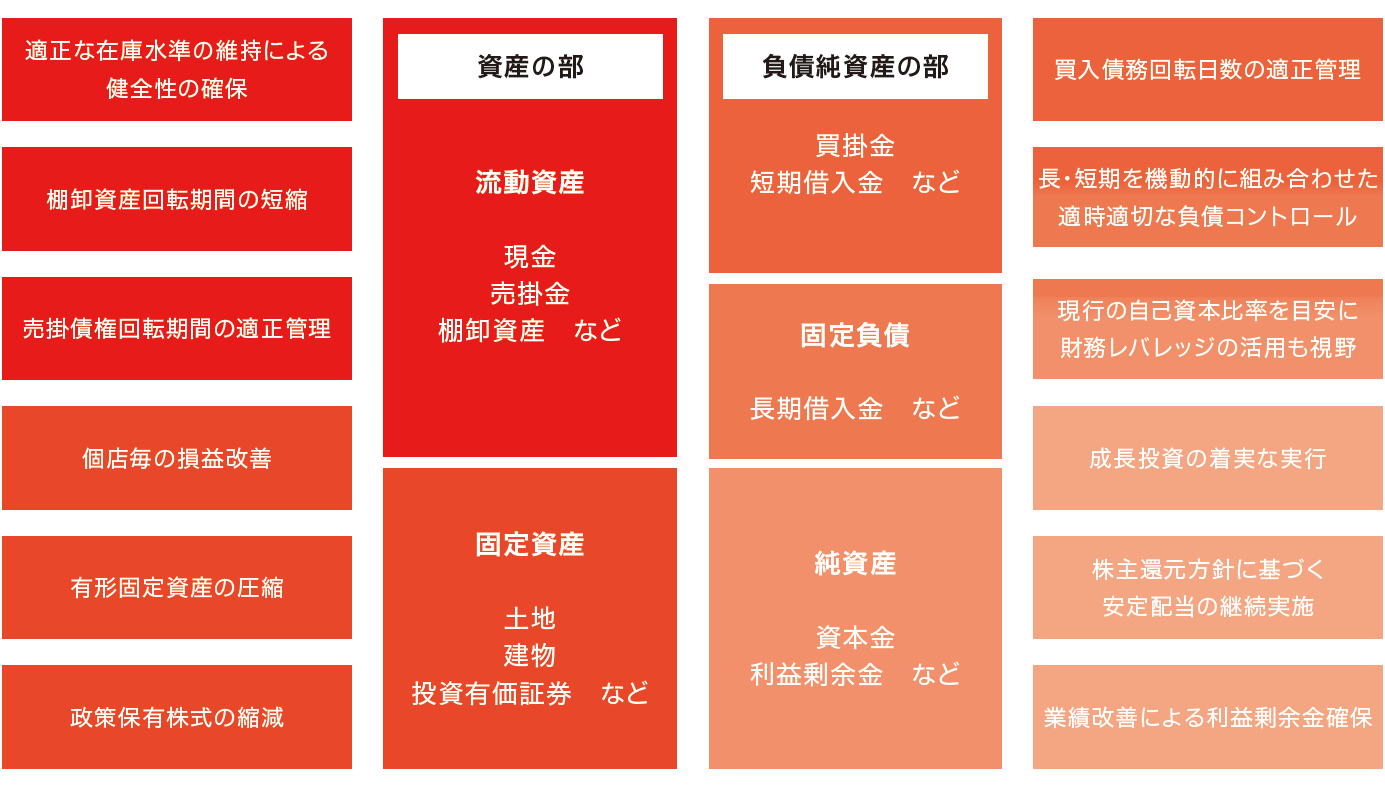 私たちの主たる業務である小売業は、店舗や設備、保証金など、投資を通じた資産がバランスシート上、重くなりがちです(取引関係に寄与する政策保有株式もその一部です)。