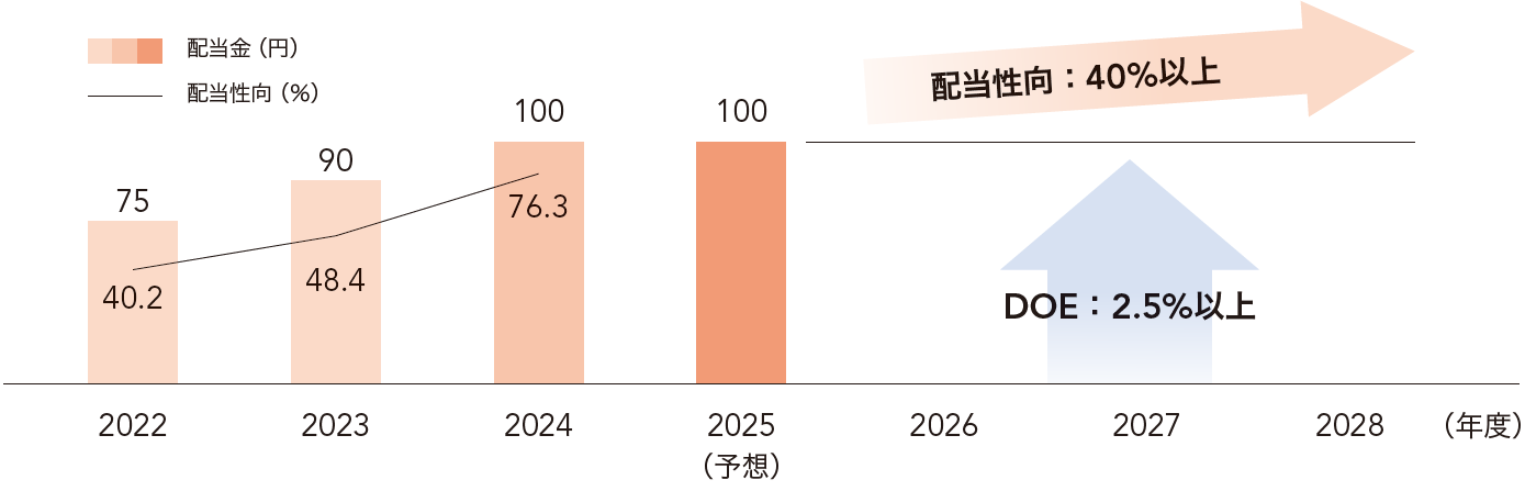 今後も株主還元を経営の最重点課題の一つとして認識し、「JT-2028 経営計画」では、配当性向40%以上に、DOE(株主資本配当率)2.5%以上を新たな指標として採用します。DOEの採用により、業績変動に左右されない安定的な還元を基本方針としつつ、今後の業績向上による増配を目指してまいります。