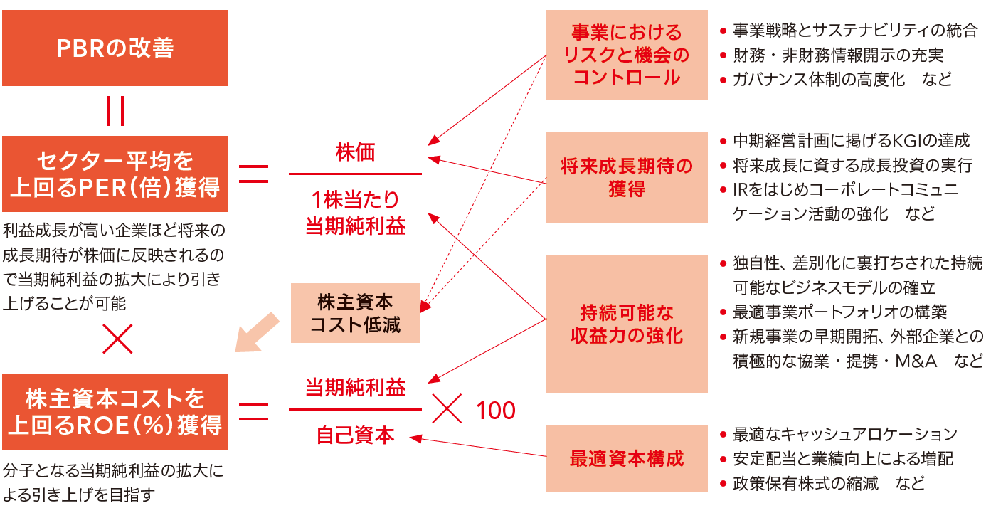 資本配分の根本となる純資産については、年度ごとの見直しや会計上のディスカッション、適切なスクラップアンドビルドの実施により最適化を図っています。この資産をベースとした事業活動における収益力の強化がEPS(1株当たり当期純利益)の拡大につながり、この持続が将来成長への期待を呼び、PER(株価収益率)引き上げ、PBR(株価純資産倍率)向上へと向かうものと考えています。