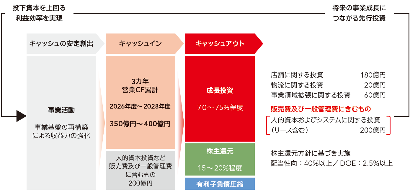 本中計では、事業から創出されたキャッシュ・フローを未来への「成長投資」として中心に据えつつ、「株主還元」「有利子負債削減」をバランスよく実施し、資本効率の最適化を進めていきます。